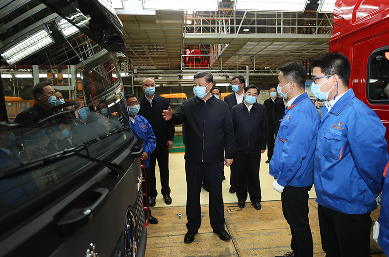 ▲2020年4月22日,习近平在陕西汽车控股集团有限公司总装车间察看生产线,了解产品研发、生产、销售和复工复产情况。